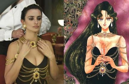 Escludendo velleità di cosplayer di Penelope Cruz (che mi piacerebbe vedere nei panni di Sailor Pluto!), la spiegazione può essere una sola: la Takeuchi per le sue illustrazioni si è spesso ispirata alle collezioni di stilisti (soprattutto italiani) recensite sulla stampa specializzata giapponese: lo stesso vestito potrebbe essere stato usato come ispirazione dai costumisti di Almodovar.