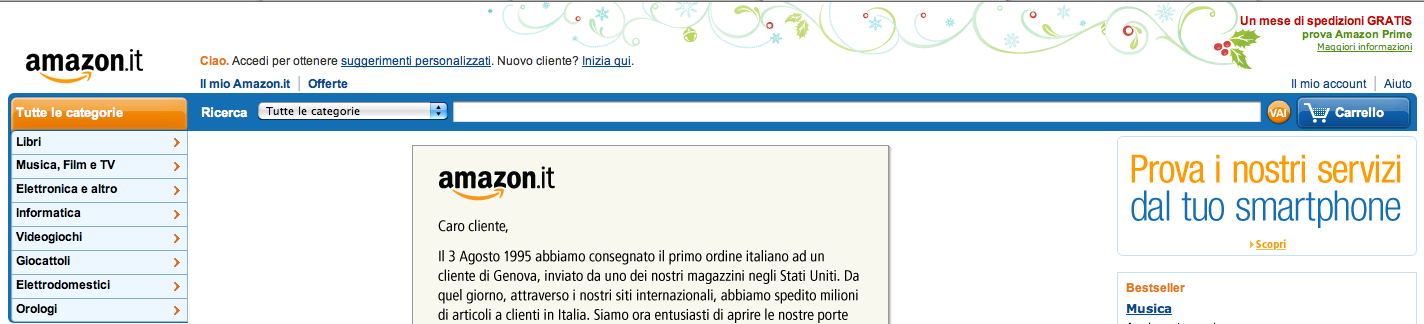 Non mi resta che augurarvi, qualora ne abbiate voglia, un buono shopping su Amazon.it, visto che ha aperto in tempo per i regali di Natale.