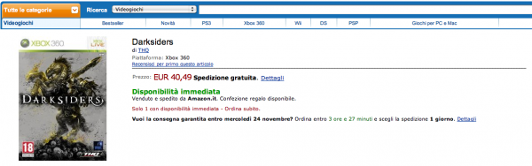 Tralasciando ogni considerazione su tasse e balzelli vari sulle opere videoludiche in Italia (influenti fino ad un certo punto), non noto una grande convenienza rispetto ai normali negozi online. Calcolando che arrivati a 25 sterline di ordine su amazon.co.uk (in questo caso due giochi) si può avere la spedizione gratuita nella nostra nazione, gli acquisti si Amazon.it sembrano quasi da evitare. Forse indagando meglio nelle varie categorie potremo trovare offerte interessanti, ma sembra che il portale si stia allineando ai prezzi degli operatori nostrani: come al solito, veniamo visti come una mucca da mungere ben bene.