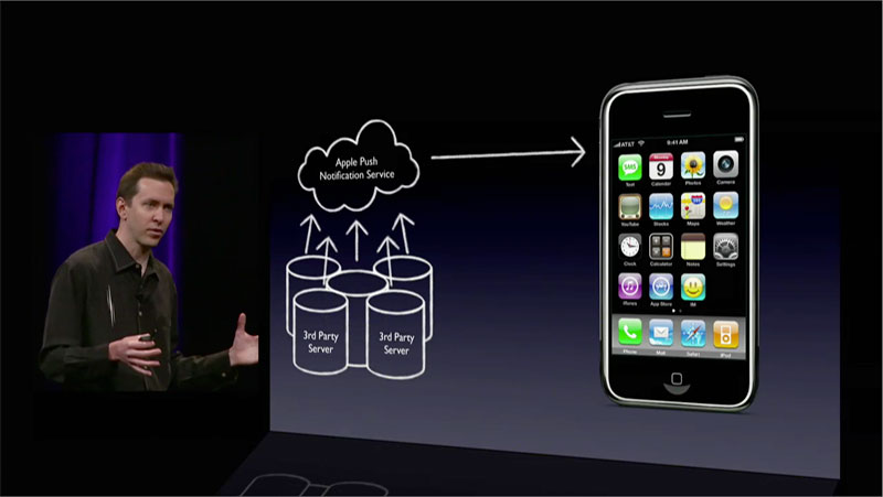 Inizialmente le notifiche push avrebbero dovuto essere inserite in iOS 2.0, ma per problemi di sviluppo furono abilitate solo nella versione successiva, la 3.0. In iOS 4.0 il sistema è rimasto pressocchè invariato, mentre la concorrenza ha nel contempo sviluppato dei nuovi metodi di notifica con interfacce grafiche diverse e più funzionali come, ad esempio, le banner push notification di WebOS, il sistema operativo di Palm che, dopo la sua acquisizione da parte di HP, ha perso Rich Dellinger, responsabile dello sviluppo del sistema di notifica, ritornato in Apple.