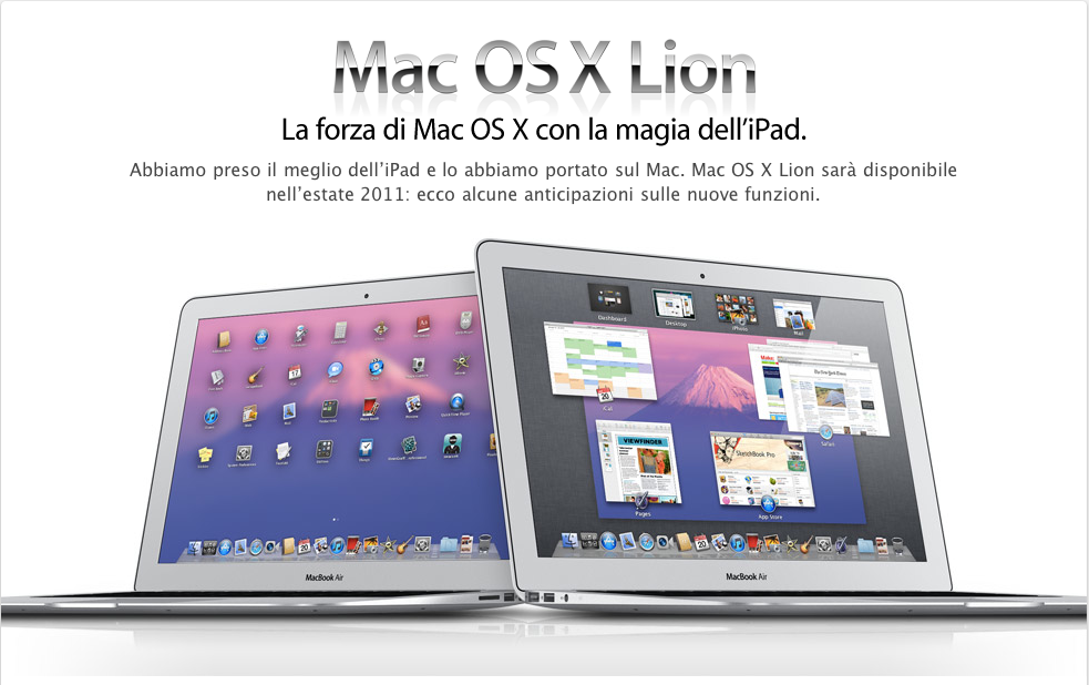 Mentre l’attenzione di tutti è stata canalizzata dall’introduzione dei nuovi MacBook (sui quali presto scriveremo attente analisi sulle nuove specifiche hardware), Apple ci stupisce ancora una volta aggiornando la pagina del proprio sito ufficiale dedicata al futuro Mac OS X: Lion. Fra le caratteristiche già note e già mostrate al pubblico durante lo scorso keynote (ricordiamo brevemente: il già disponibile Mac AppStore; LaunchPad, una nuova schermata che ricalca molto la home di iOS da cui è possibile avviare le applicazioni installate sul nostro sistema; le app a tutto schermo; MissionControl, l’evoluzione di Exposè che integra anche la Dashboard, per una gestione più ordinata delle applicazioni aperte; nuove gesture che rendono Mac OS X fruibile con le periferiche multitouch quasi come se fosse un iPad), vengono elencate altre feature che sono realmente destinate a migliorare nettamente il nostro modo di lavorare con Mac OS X: