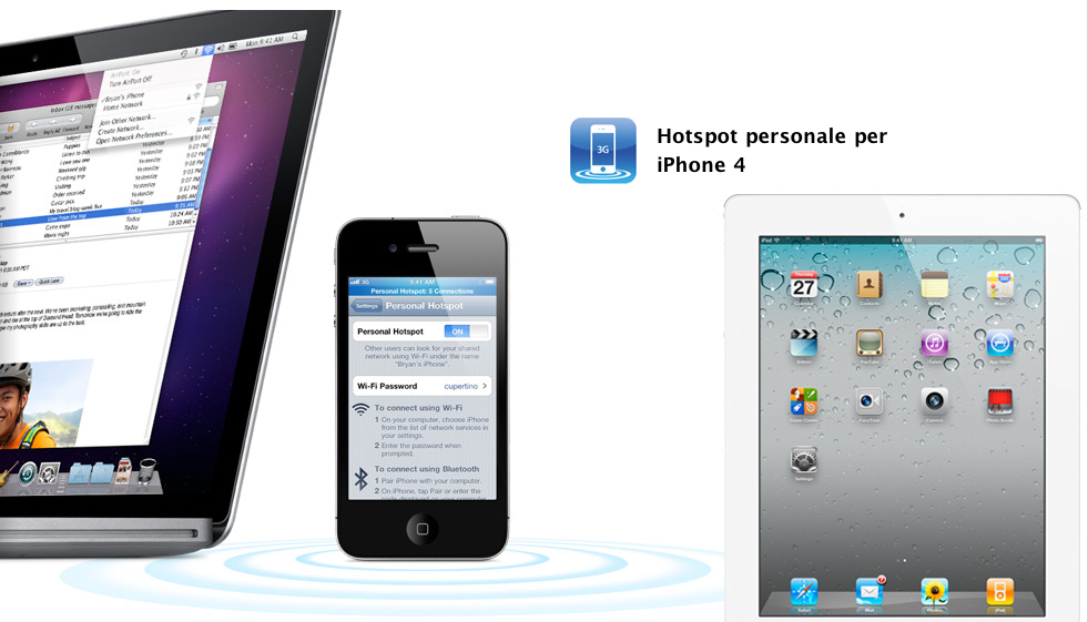 Fra cinque giorni Apple rilascerà ufficialmente iOS 4.3 per iPhone, iPod Touch e iPad, che, fra le altre migliorie, porterà con sè, ma solo per iPhone 4, la funzione Personal Hotspot, che oltre al tradizionale tethering via bluetooth e USB permetterà di condividire la connessione 3G via wifi con massimo 3 dispositivi (dunque, 5 in totale).