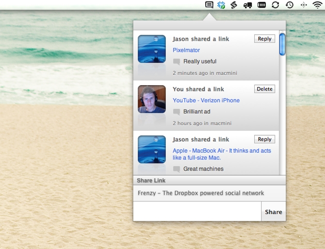 Frenzy salva tutti gli status, i file, i messaggi, le immagini e tutto quello che volete condividere in DropBox e poi lo mostra in uno stream molto simile a quello di Twitter.
