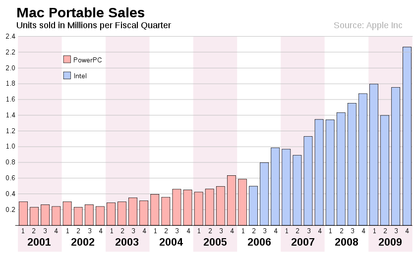 I chip della serie Core videro la luce ben sei mesi prima del previsto: Apple iniziò subito a produrre i nuovi portatili che furono ribattezzati per l’occasione MacBook e MacBook Pro, in chiaro segno di rottura con il passato: erano i portatili più veloci e performanti sul mercato, tanto che, negli anni, le vendite sono aumentate esponenzialmente: