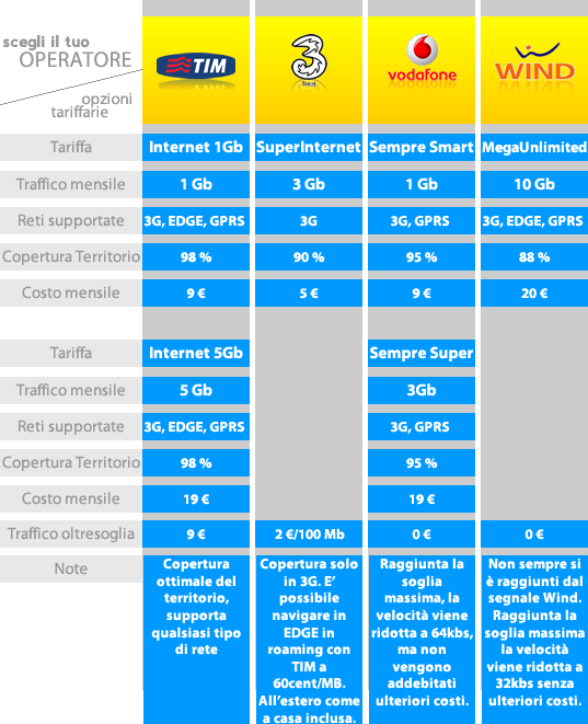 Wind offre a 20 € la Mega Unlimited con 10 Gb di traffico mensile (per i primi 6 mesi il costo è di 10 €). Supporta la tecnologia Edge, ma la rete è più lenta di Tim e Tre e non ha un’ottima copertura nazionale. Il traffico oltresoglia non viene tariffato, ma la velocità di navigazione è limitata a 32 kbps.