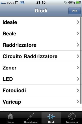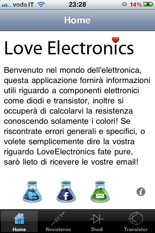 LoveElectronics si compone di quattro sezioni dedicate rispettivamente alla presentazione dell’app, dov’è possibile trovare anche i contatti dello sviluppatore; al calcolo delle resistenze, infine ai diodi e transistor.