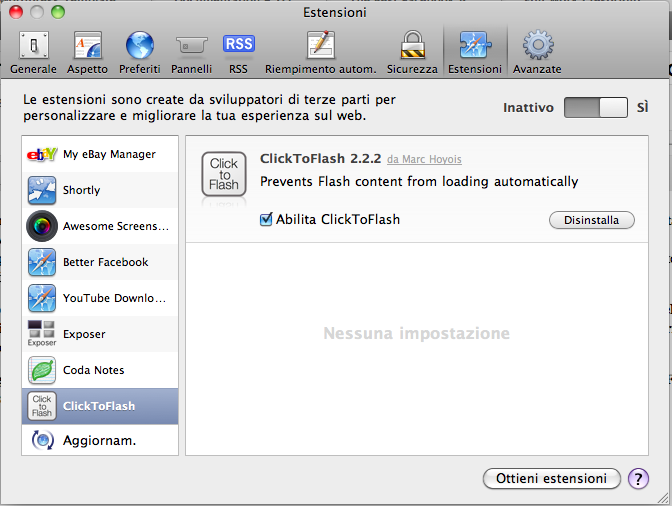 Era da tanto che attendevo una conversione di ClickToFlash anche per Safari (browser che, nonostante la sua pesantezza in alcune situazioni, trovo più stabile ed affidabile di Chrome e FireFox su Mac) e, finalmente, è disponibile nella Extensions Gallery di Apple.