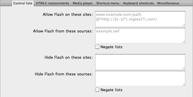 Per ovviare al problema della navigazione di siti realizzati interamente in Flash (tipo Nike.com) è possibile creare (accedendo alle preferenze del plugin cliccando col pulsante destro su una pagina web e scegliendo la voce ClickToFlash Preferences…) una lista di indirizzi per i quali ClickToFlash non deve essere eseguito oppure, sempre tramite il click destro, è possibile caricare tutti gli oggetti Flash in un solo colpo.