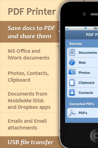 PDF Printer è localizzata in: Inglese e Giapponese; è compatibile con iPhone, iPod touch e iPad. Richiede l’iOS 4.3 o successivi.