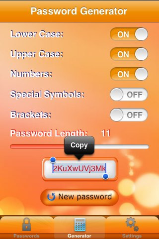 Il pannello “Generator”, come dal nome, è destinato alla generazione di password. Ma prima possiamo decidere le caratteristiche che la password deve avere: lettere maiuscole, minuscole, numeri, simboli, parentesi e lunghezza in numero i caratteri. Fatto ciò attraverso il pulsante “New Password”, ad ogni tap sarà creata una nuova successione di caratteri con le caratteristiche assegnate.