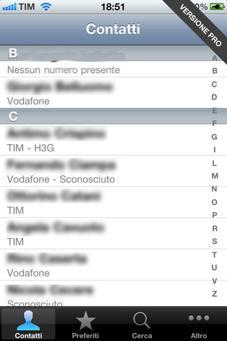In versione Pro, effettuando l’In App Purchase, sarà possibile, una volta effettuata la scansione della rubrica, visualizzare il gestore telefonico associato ad ogni numero di ogni contatto (qualora quest’ultimo possegga più di un numero di telefonia mobile). Con l’upgrade sarà aggiunta anche una sezione preferiti ed una contatti attraverso le quali, rispettivamente, raggiungere più rapidamente un contatto e scorrere l’intera rubrica.