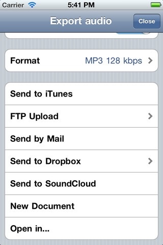 Una volta ottenuto il risultato desiderato il lavoro svolto può essere quindi esportato scegliendone nome e formato e nei casi che lo richiedano la bitrate. A questo punto si può scegliere come condividere o trasferire il file ottenuto, con l’iTunes File Sharing, con l’FTP, via email, verso Dropbox, verso SoundCloud, in un nuovo documento o infine aprirlo in un’altra app.