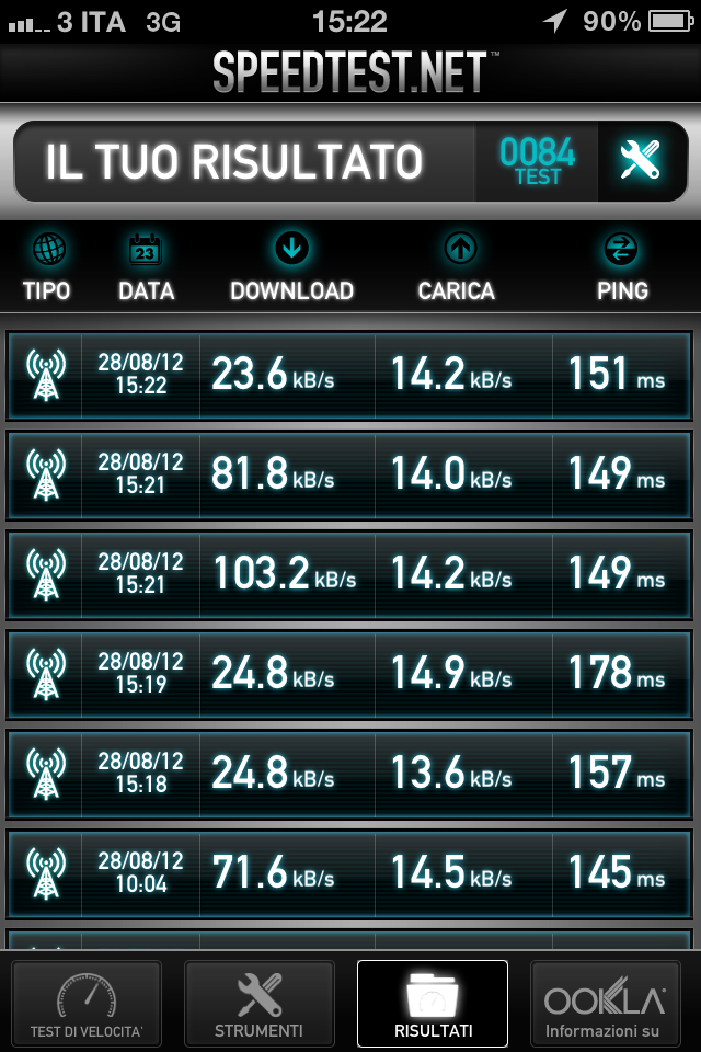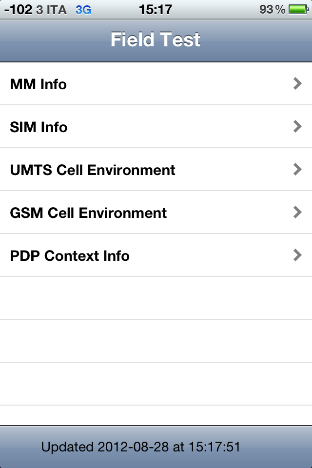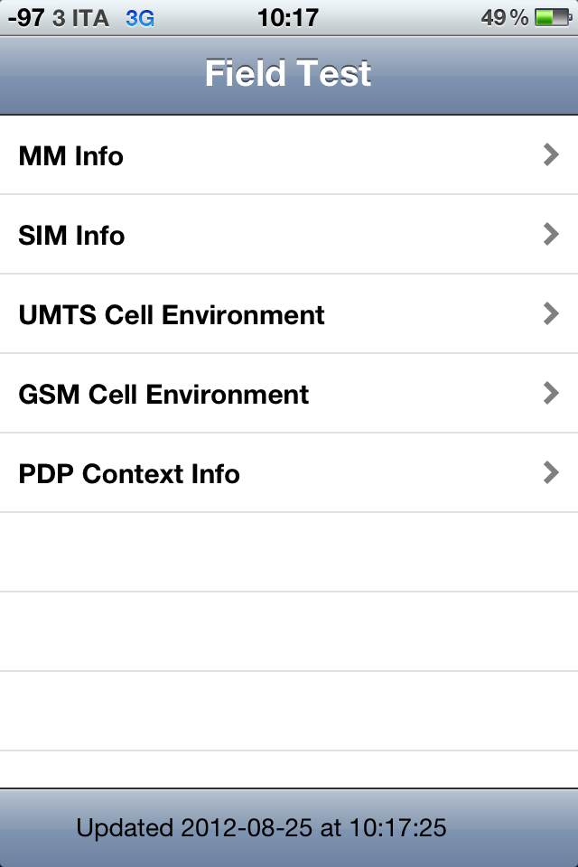Per la parte telefonica, ricordiamo che ad un valore inferiore in dB, corrisponde una potenza del segnale superiore, e quindi una migliore ricezione. Questi screenshot sono stati effettuati accedendo all’area di Field Test, accessibile digitando sul testierino numerico dell’iPhone il seguente codice, *3001#12345#*, e premendo successivamente il pulsante verde che farebbe partire la chiamata.
