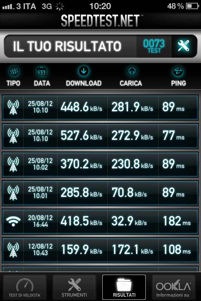 Le nostre prove in condizioni di ricezione minima. I primi due screenshot si riferiscono al prima e dopo l’applicazione dell’antenna; nel terzo gli ultimi tre risultati si riferiscono al prima, e i primi tre al dopo.
