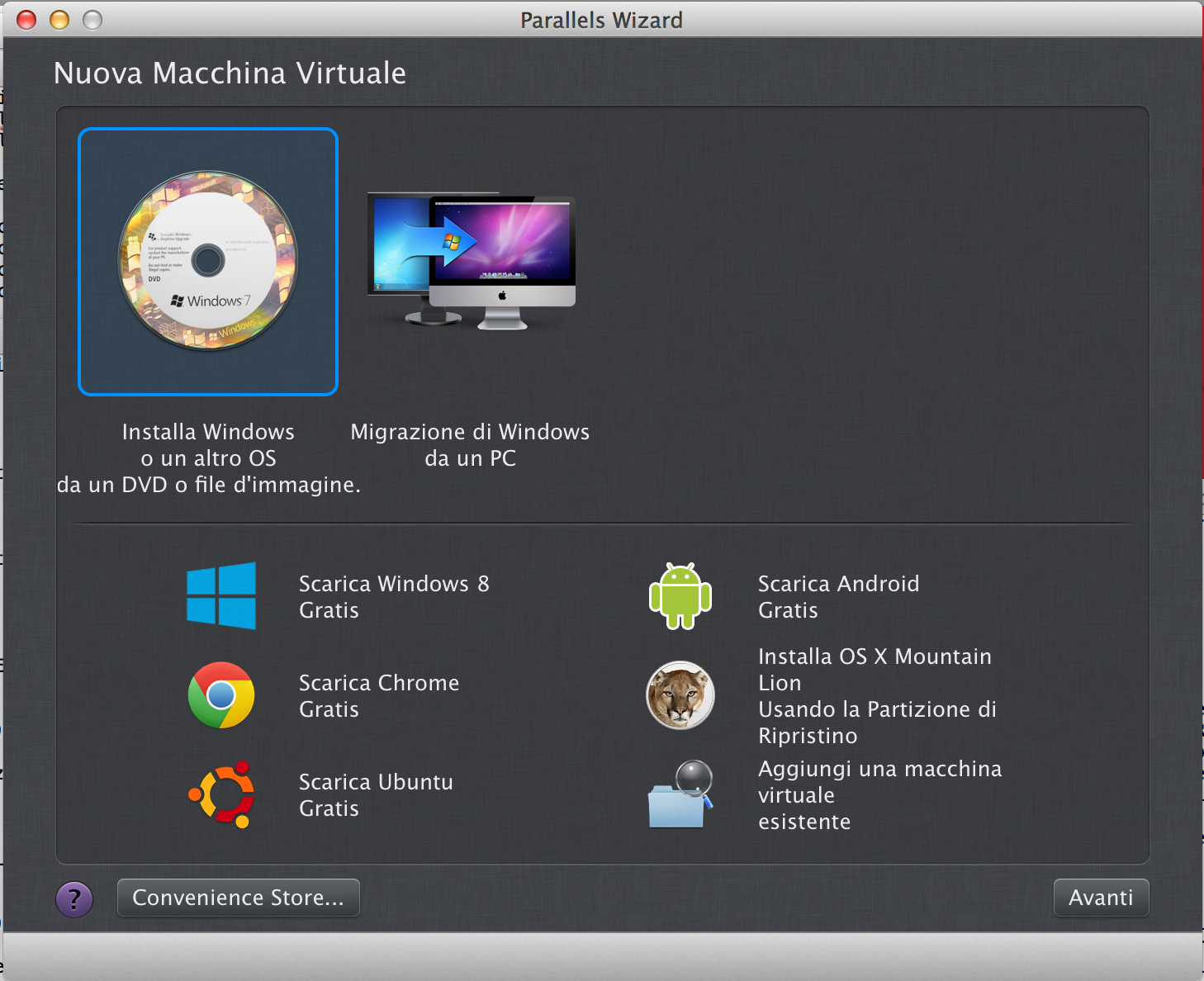 Una volta terminata l’installazione di Parallels Desktop possiamo scegliere il sistema operativo da scaricare, installare e lanciare. È possibile scegliere tra: Windows, Android, Chrome ed Ubuntu.