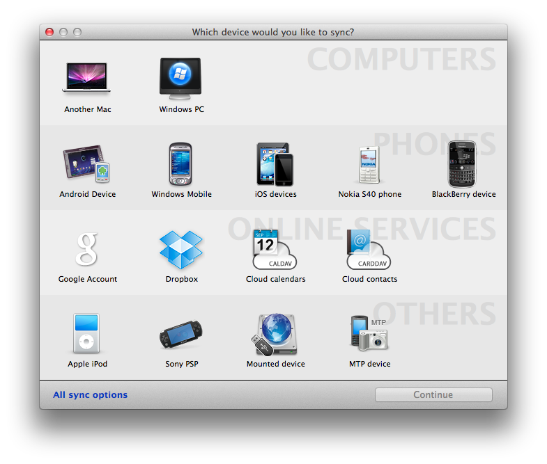 Lo step successivo è con cosa sincronizzare. Bene, le opzioni di scelta sono, tra i servizi online: Account Google, Dropbox; come dispositivi appaiono invece: un altro Mac o un PC, dispositivi mobili con SO Windows Mobile, Android, Nokia S40 e Blackberry, PSP, iPod Nano, iPhone, iPad, iPod Touch, Hard Disk esterni e altri accessori che supportano il Media Transfer Protocol.