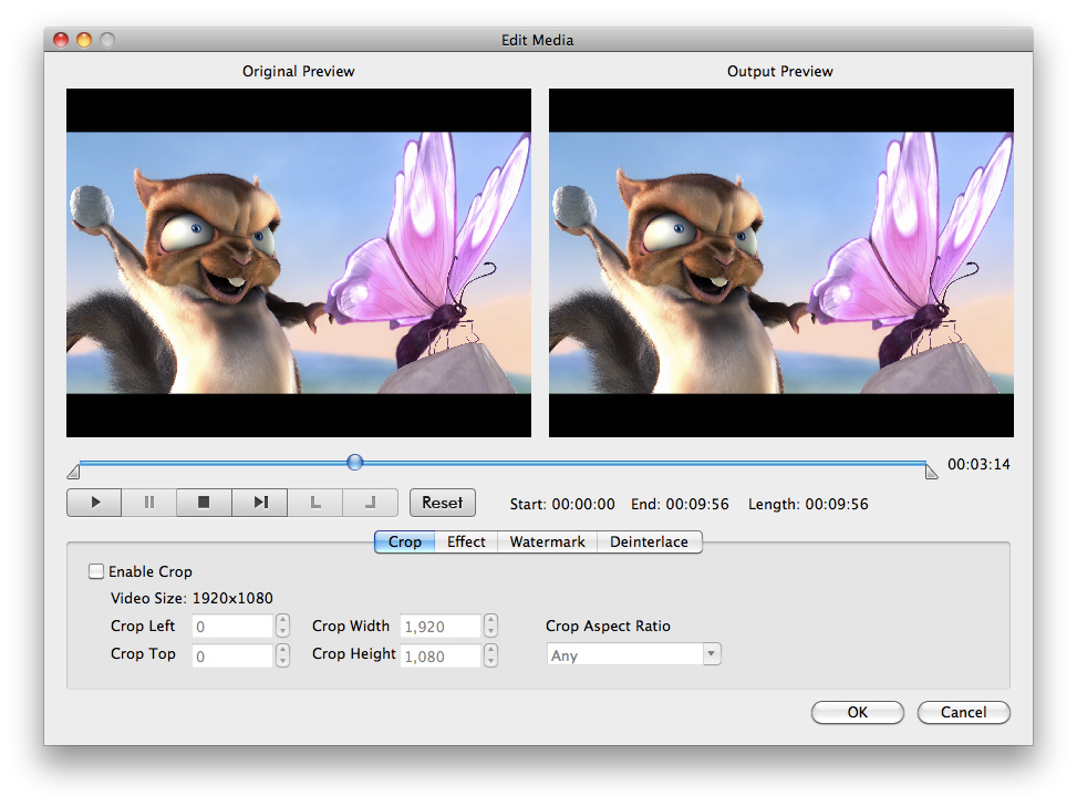 Come accennato, è possibile intervenire anche sul filmato stesso per apportare alcune modifiche quali: durata, dimensioni e rapporto, effetti, luminosità e contrasto, deinterlacing, e impressione filigrana come di testo o immagine.