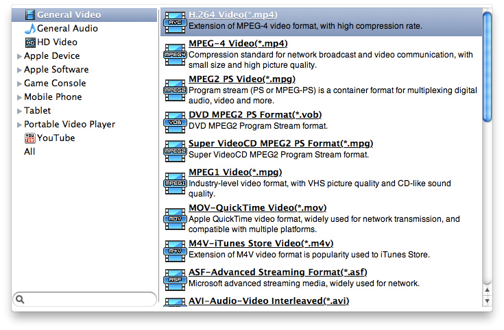 Scendendo nel dettaglio delle caratteristiche. Per la scelta del formato verso il quale si vuole che sia convertito il filmato sorgente, è possibile scegliere attraverso una categorizzazione ordinata per dispositivi e applicativi. Per il primo genere sono disponibili prodotti Apple come iPhone, iPad, iPod ed Apple TV; consolle di gioco quali Xbox360, PSP, PS3, Wii e Nintendo DS; smartphone Android, BlackBerry, Symbian e Windows Phone; tablet Amazon, Samsung ecc. ma anche riprodottori video portatili meno diffusi tra cui Zune. Per la seconda categoria invece, sono presenti software Apple come iTunes, iMovie FinalCut e iDVD ed infine i formati accettati da YouTube.