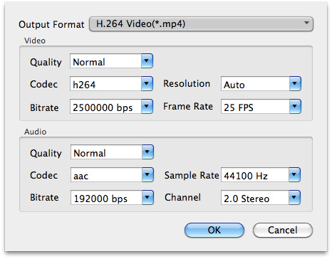 Una volta scelto il formato, la qualità è più o meno personalizzabile a seconda della tipologia scelta. Si può impostare i parametri in maniera meno professionale dalla finestra principale. Altrimenti si può intervenire con maggiore dettaglio; per la parte video: Video Encoder, Frame Rate, Video Bitrate, Risoluzione; per la parte audio: Audio Encoder, Frequenza di campionamento, Canali, ed Audio Bitrate.