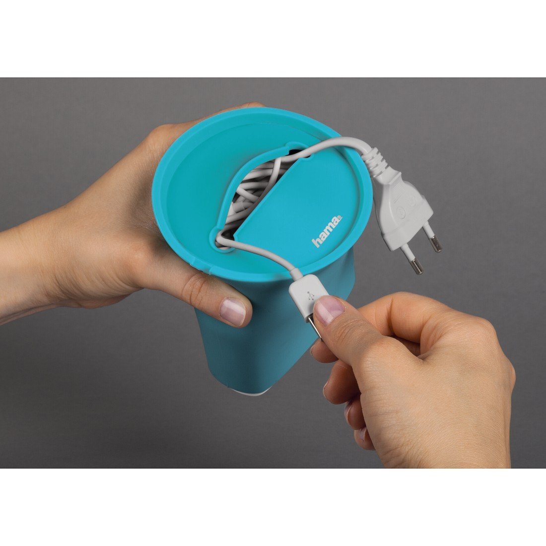 La stazione di ricarica Hama però non si limita solo a risolvere la problematica succitata, ma, grazie al suo involucro in gomma, costituisce un buon complemento d’arredo. La guaina che ricopre la “multipla” in sé per sé però, a ben guardare, non svolge un ruolo puramente estetico, ma è utile per tenere raccolti ed in ordine sia il suo cavo di alimentazione che altri eventualmente. Nella parte inferiore, che funge da base, vi è infatti una fessura che consente l’accesso a questo vano, non proprio angusto, che può ospitare comodamente quattro cavetti USB se quello proprio è svolto.